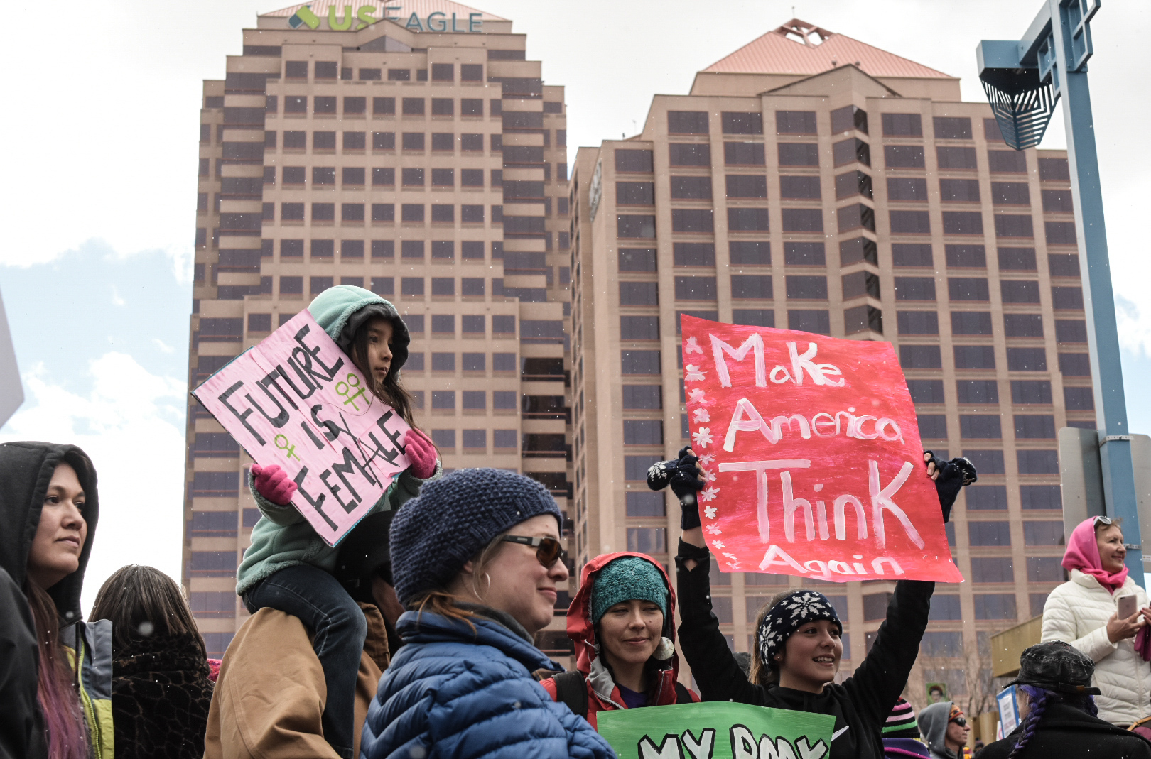 Snow falls on rally attendees standing on the Civic Plaza fountain during the Albuquerque Women’s Rally, Saturday, Jan. 21, 2017. (Kevin Maestas / @ DailyLobo)