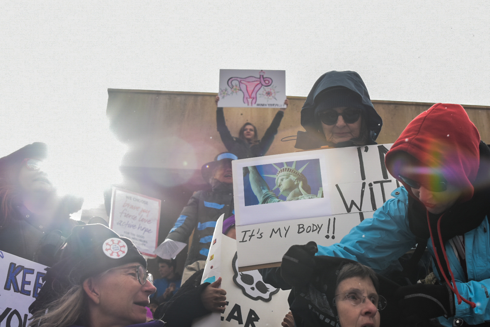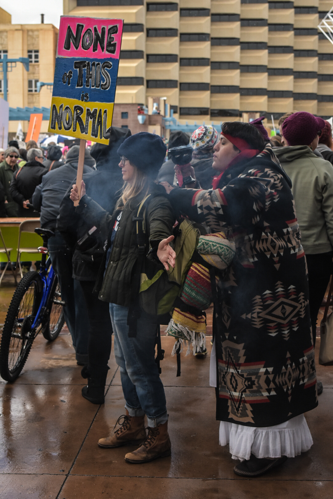 Rally participants standing on the Civic Plaza fountain brace for winter weather conditions during the Albuquerque Women’s Rally, Saturday, Jan. 21, 2017. (Kevin Maestas / @ DailyLobo)