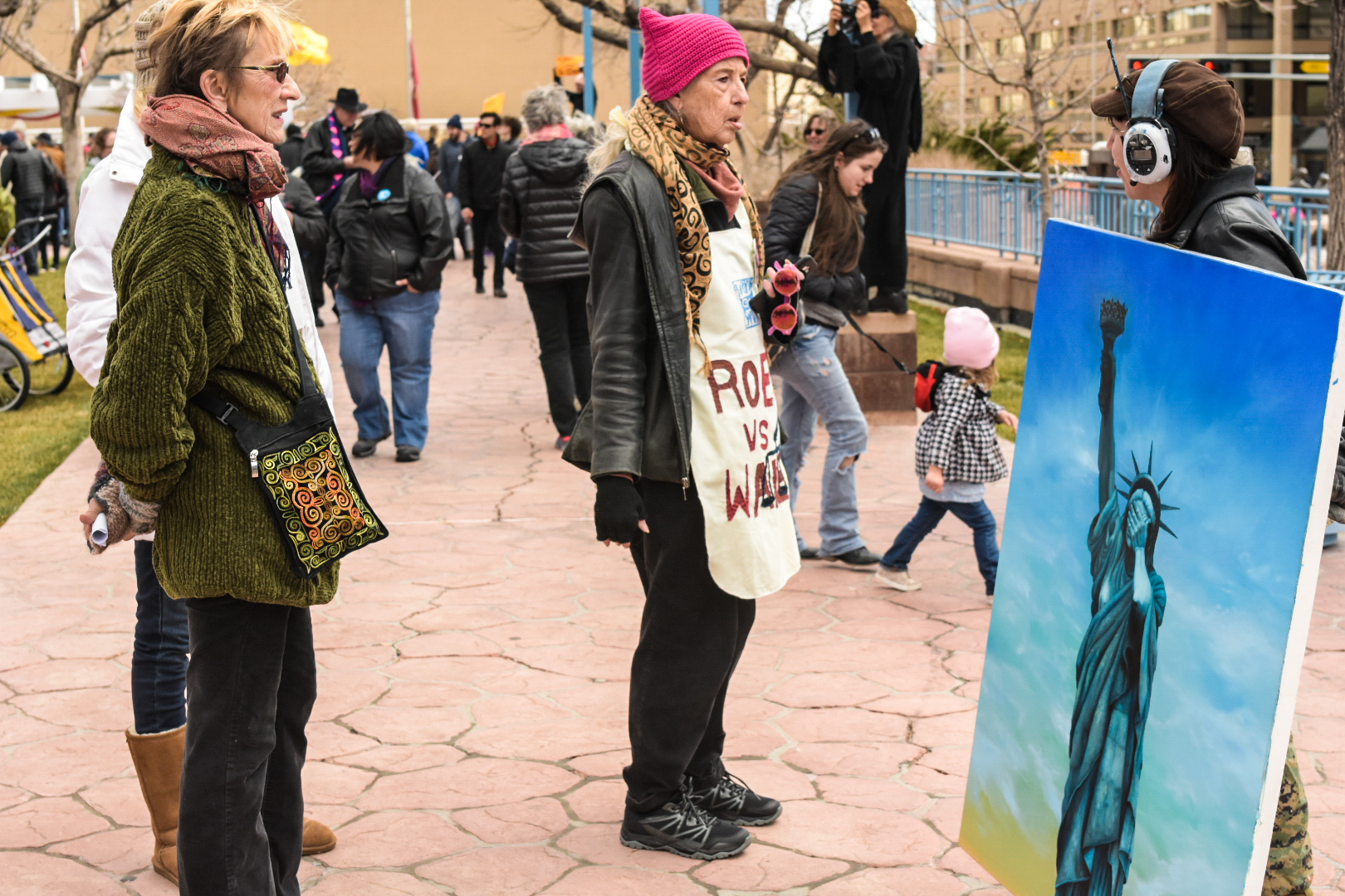 Katie Neeley, far right, exhibits her Oil Painting “My Lady,” on Civic Plaza, Saturday, Jan. 21, 2017, in Albuquerque, N.M. The Albuquerque rally was held as hundreds of rallies and marches spread across the country and around the world. (Kevin Maestas)