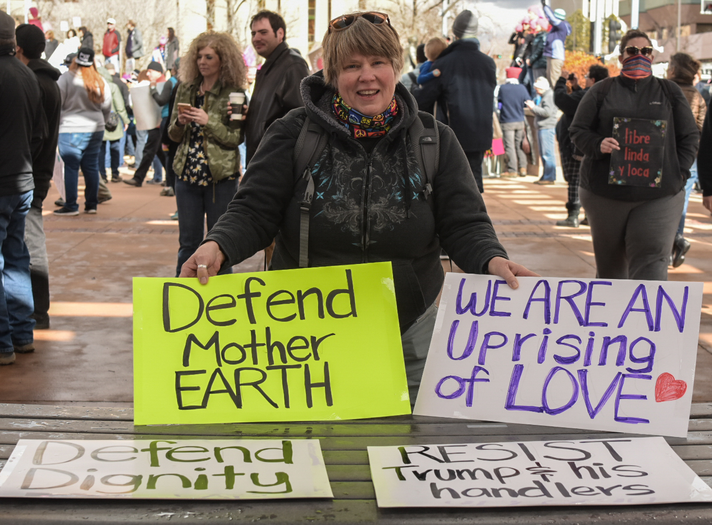 Belen resident, Kit Zimmerman, shares signs with rally attendees during the Albuquerque Women’s Rally, Saturday, Jan. 21, 2017. (Kevin Maestas)