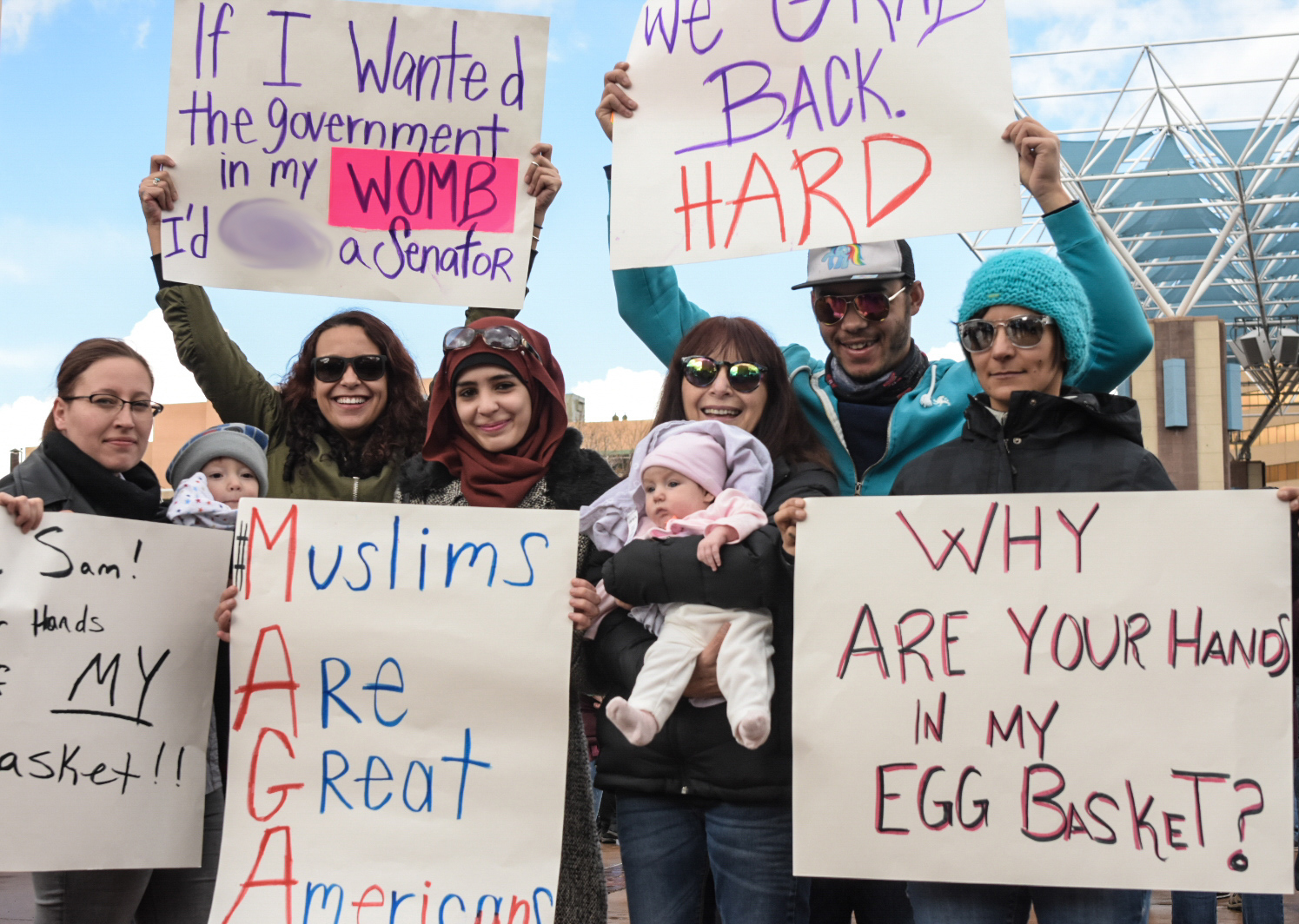 From left to right, Erika Eddy, Felix Baca, Keelin, Sabrin, Rebekah, Scarlett Baca, Seth, and Adrienne of the Hindi family hold signs in response to the inauguration of Donald Trump and controversies on the campaign trail, Saturday, Jan. 21, 2017. (Kevin Maestas / @ DailyLobo)