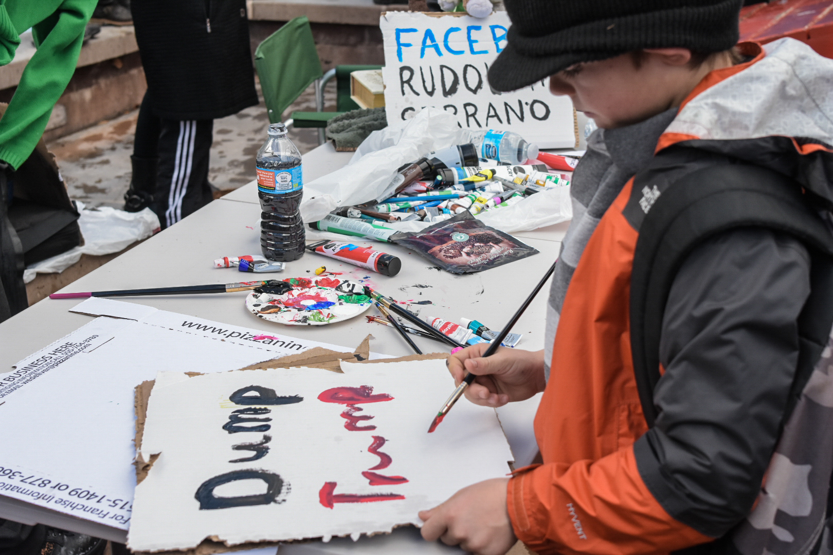 Aaron Edwards creates a sign near the Civic Plaza fountain, Saturday, Jan. 21, 2017. (Kevin Maestas / @ DailyLobo)